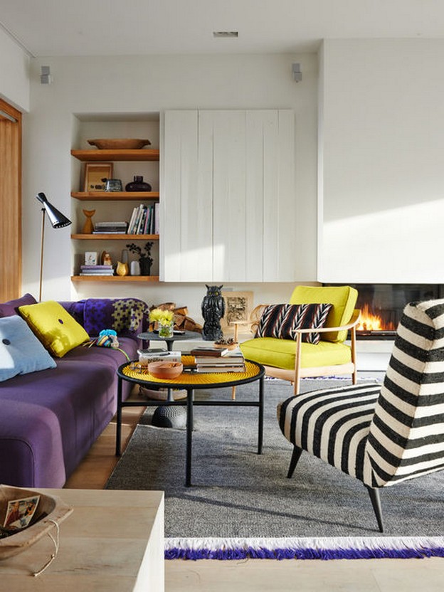 Комбинация с другими яркими цветами уместна для гостиной в стиле фьюжн.