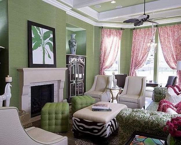 - Мебель зелено-оливкового цвета будет органичной в интерьере гостиной в коричневых тонах, в отделке персиковой, желтой, болотной гаммы.