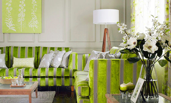 Довольно редкое, но интересное сочетание может получиться из «скользких», хорошо отражающих свет оттенков. Зеленый диван в интерьере гостиной может быть как светлым, так и темным – но во втором случае смесь может получиться слишком тяжеловесной и солидной. Салатовый же оттенок замечательно смотрится в окружении серебра – взгляните на фотографию ниже, где обивка дивана украшена широкими полосками.