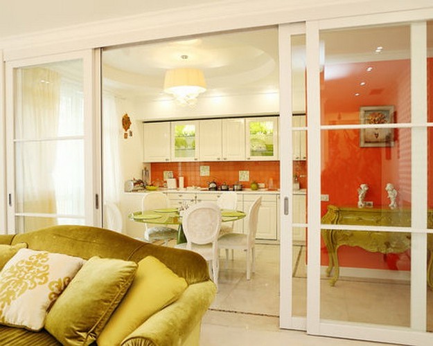 В таких комбинациях участвуют абсолютно все детали – столы, стулья, текстиль, декор. Как правило, светлые нейтральные тона окрашивают стены (это преимущественно белый, молочный, бежевый, пастельный желтый), а более насыщенные – аксессуары, узоры в коврах, текстильных поверхностях.