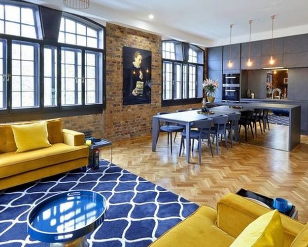 Другой яркий контраст — это сочетание с синим. Часто оно используется в детской комнате. Оба этих цвета активно противоборствуют в привлечении внимания, но вместе с тем компенсируют друг друга: синий способствует концентрации внимания, а желтый успокаивает и расслабляет. В гостиной можно постелить ковер в этой расцветке.
