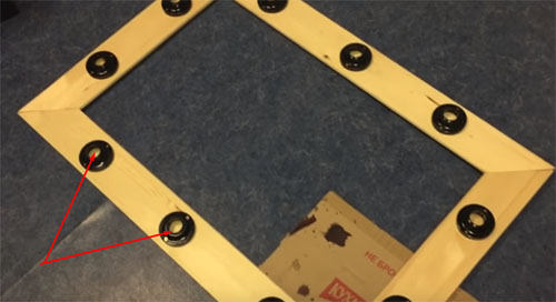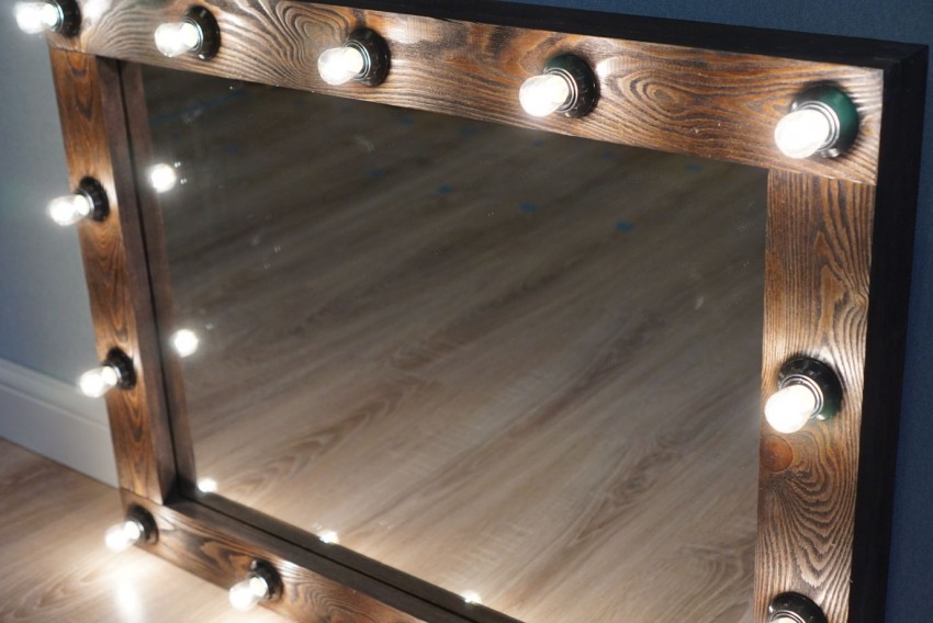 Как сделать своими руками зеркало с лампочками? После монтажа электрических элементов, необходимо спрятать оголённые контакты под клейкую ленту или замазать паклей. Оставшиеся деревянные детали крепим уголками перпендикулярно к раме и закрепляем зеркальное полотно. Его можно посадить на мебельный край или укрепить пластинами.
