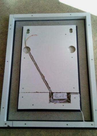 После полного высыхания зеркало вешается на свое место и подключается питание. На этом, собственно, работа по изготовлению зеркала с подсветкой своими руками окончена.