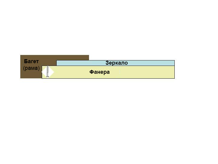 Далее изготавливается рамка из толстой фанеры или доски (толщина выбирается мастером, исходя из его предпочтений). Размер ее должен быть таким, чтобы зеркало точно входило внутрь. Собирается она при помощи жидких гвоздей и шурупов, не помешает скрепить ее металлическими уголками. Также необходимо изнутри закрепить мебельные уголки, на которые и ляжет полотно.