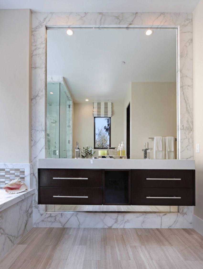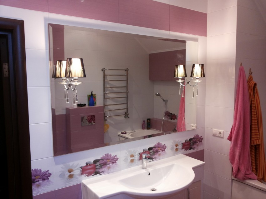Еще до процесса укладки кафеля. Но даже если вы не оставили место для зеркала, его можно приклеить на поверхность плитки с помощью специального двустороннего скотча.
