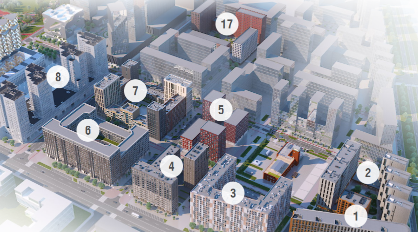 ЖК с подземной автостоянкой и детским садом на участке 17 (проект бюро SPEECH) имеет высоту от 5 до 14 этажей. Его площадь комплекса составляет 66,1 тыс. кв. м.