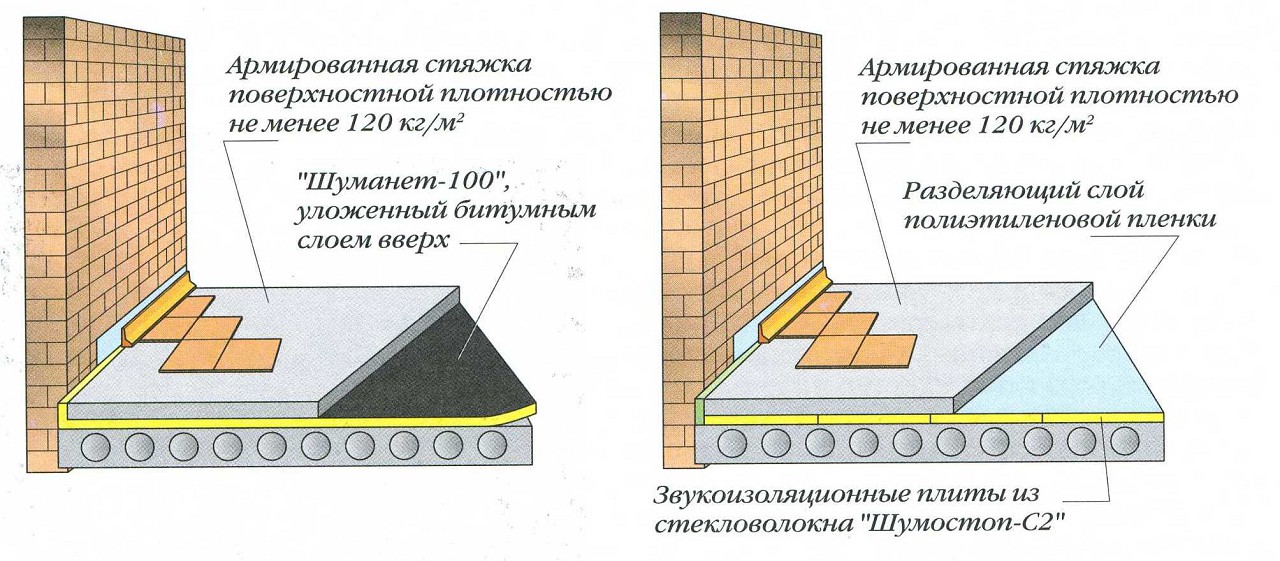Ламинат или паркетная доска может быть уложена на выравнивающее покрытие «Шумапласт», «Шуманет-100Гидро», «Шуманет-100Комби», «Шумостоп». При этом толщина звукоизолирующей основы составляет всего 1 см, а конструкция будет обладать хорошей способностью к изоляции. При этом изоляция ударного шума будет иметь значения до 43 дБ, а изоляция воздушных шумов – 8–10 дБ. Для улучшения характеристик по периметру помещения укладываются специальные кромочные плиты, а швы между материалами заделываются герметиком.