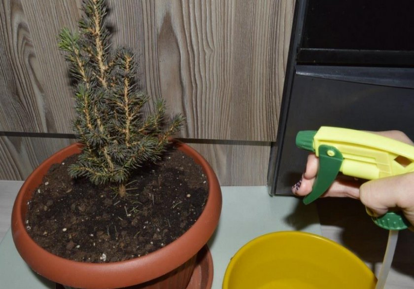 - Маленькая елка в горшке опрыскивается только мягкой водой (талая, отстоянная или дождевая).