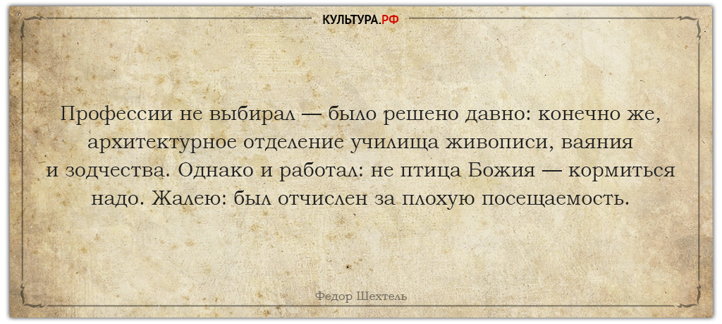 Федору Шехтелю приходилось заботиться о больной матери и много работать, чтобы содержать семью. Времени на учебу почти не оставалось — и в 1878 году студента отчислили за «плохую посещаемость». В результате он не получил диплом архитектора, но работал в архитектурных мастерских Александра Каминского, Дмитрия Чичагова, Константина Терского.