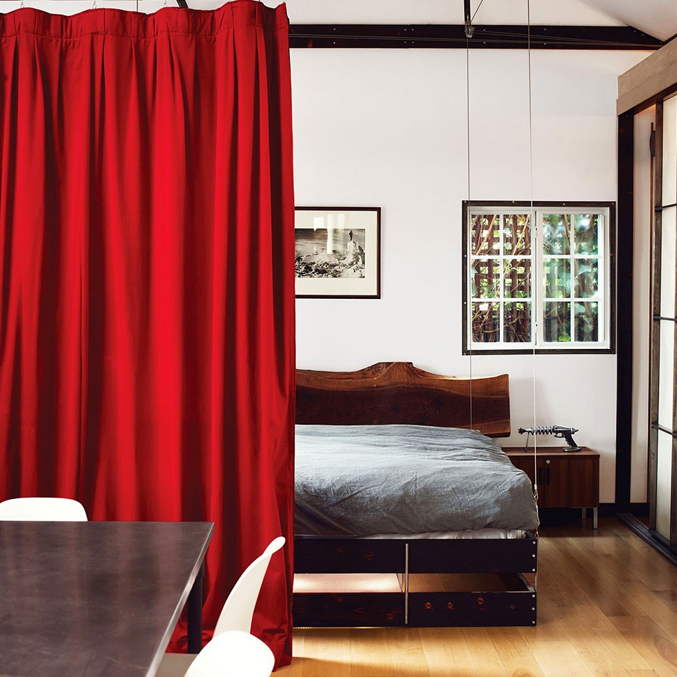 Другим способом зонирования комнаты является использование раздвижной перегородки. Этот вариант многими выбирается из-за его преимуществ перед предыдущим способом — мобильности, лёгкости, а также малой занимаемой площадью. Также стоит отметить и тот факт, что такой способ разделения может быть реализован самим хозяином комнаты при наличии необходимых материалов.