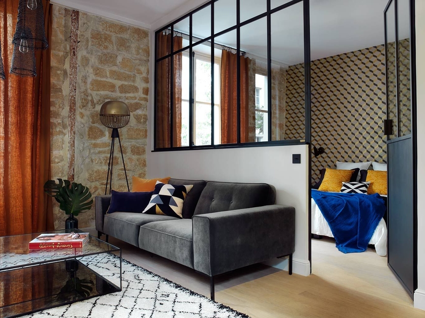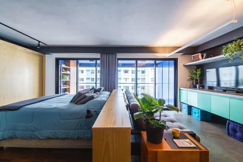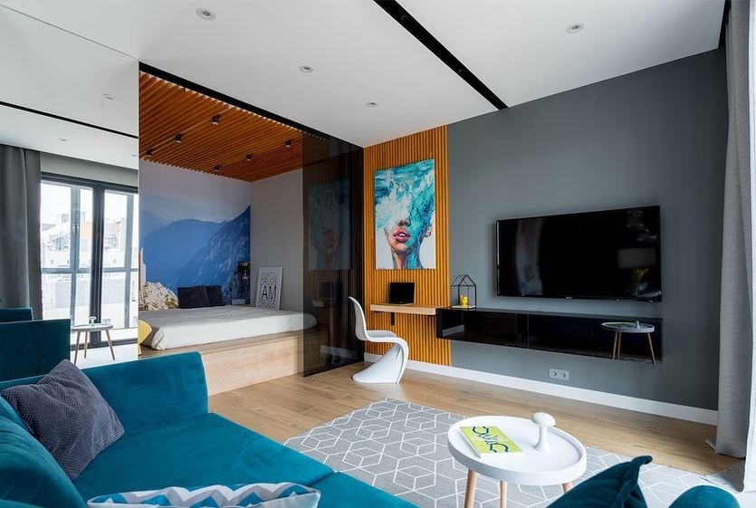 Это один из самых сложных способов, большинство однокомнатных квартир еще и очень маленькие. То есть сталкиваются вместе два совета. Первый: чтобы разграничить две зоны используйте разные (но сочетающиеся) цветовые схемы и отличающиеся по фактуре отделочные материалы, мебельный текстиль и т.д. Второй: чтобы сделать квартиру визуально просторнее, используйте для всех зон один и тот же отделочный материал. Поэтому владельцам маленькой однокомнатной квартиры придется искать компромисс или прибегнуть к этому совету в последнюю очередь.