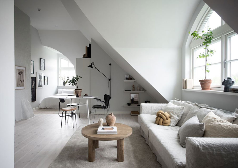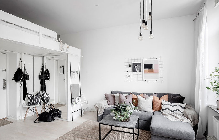 При делении на функциональные зоны может возникнуть ощущение переполненности или хаоса. Добавить воздушности и легкости интерьеру помогут бежевые, кремовые, белые стены, мебель и текстиль. В маленьких квартирах для большего визуального порядка лучше отдать предпочтение плоским плафонам осветительных приборов.
