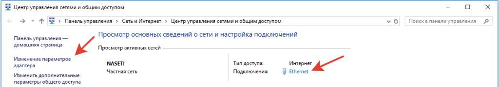Там вы можете нажать на изменение параметров адаптеров и выбрать нужное подключение. Проще прямо в этом же окне нажать на “Ethernet” для нужной сети. После этого попадаем в окно состояния.