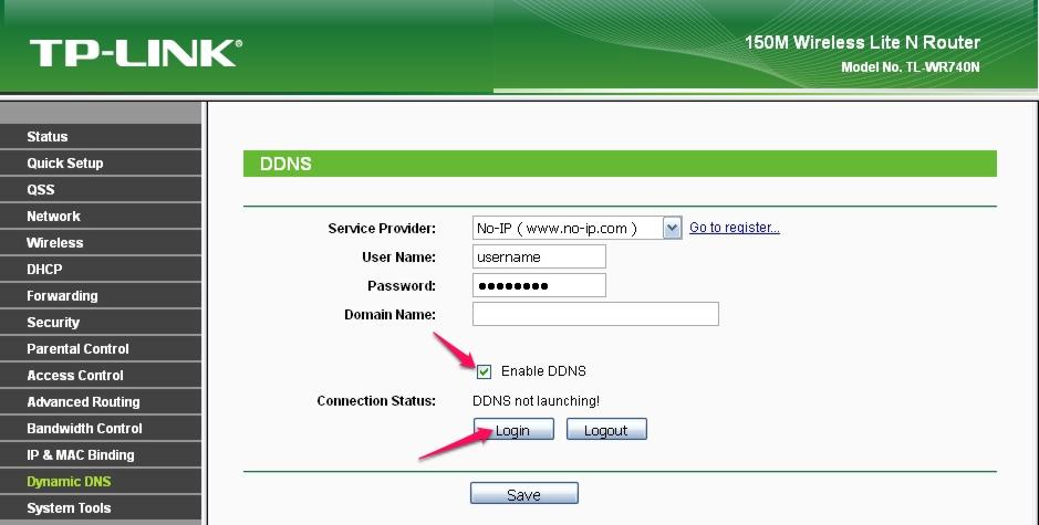 Вводим данные открытого аккаунта и наименование домена. Включаем Enable DDNS», нажимаем «Login» и после установки соединения с сервером, сохраняем параметры.
