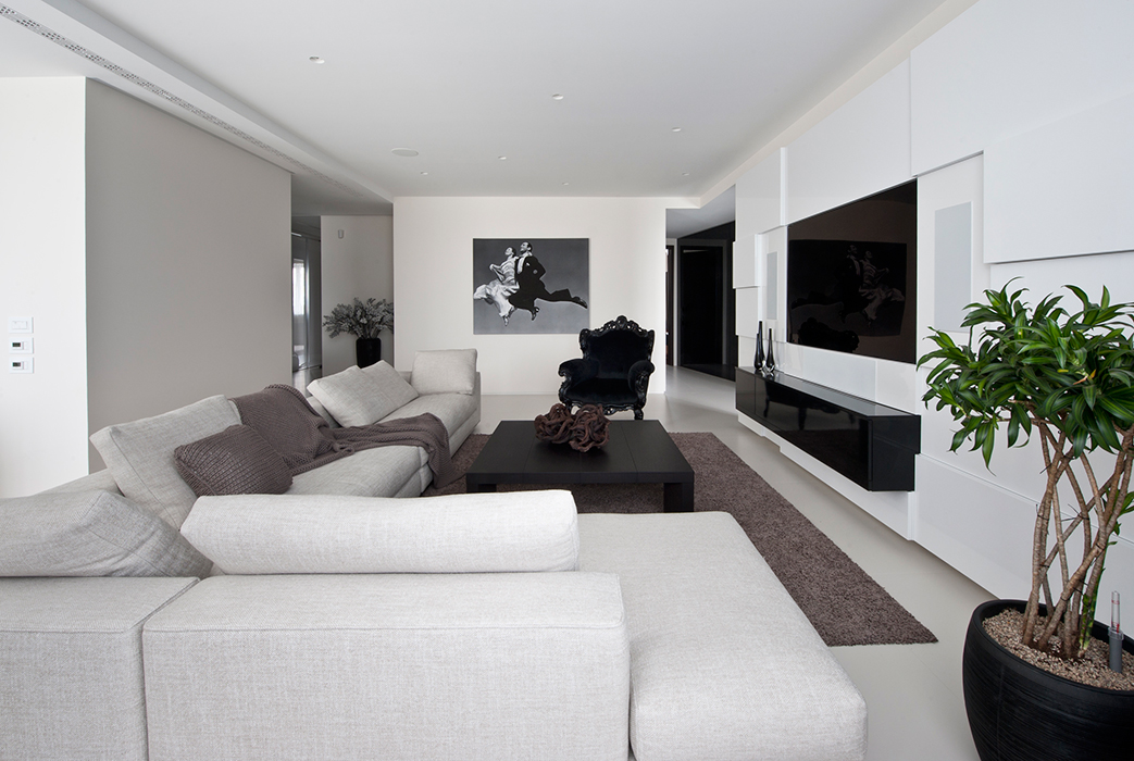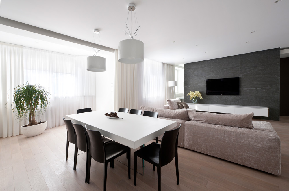 Использовать чистый белый в интерьере на больших поверхностях — неправильно, интерьер получается стерильным и мертвым. Однако «белые интерьеры» тем и хороши, что цвета можно добавить за счет мебели и декора. Всегда есть предметы, которые можно заменить: кресло, ковер, посуда, цветы, наконец. Именно они придают акцентности интерьеру. Если стены, пол, потолок сделать цветными, то можно создать беспокойную атмосферу. Мы делаем холст, на котором заказчики могут нарисовать в дальнейшем всё, что угодно.