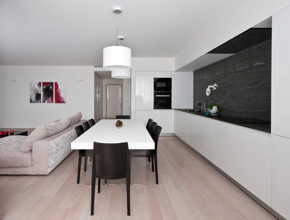 Освещение подобрано максимально комфортно для глаз. Встроенные точечные светильники утоплены относительно плоскости потолка и не слепят, даже когда включены. Мебель подбиралась на заказ из Италии и Германии. Здесь присутствуют изделия таких фабрик, как Lago, Swan, Bulthaup, Antonio Luppi, Cassina, Vitoria. Все двери замаскированы, они без наличников со скрытой коробкой и отделаны в материале стен, на которых находятся. Все двери до потолка, что создает иллюзию, будто это тонкие рассечки на стене.