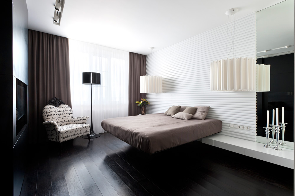 Все цвета из нейтральной, натуральной гаммы, выбор которой продиктован канонами эко-минимализма. В этом интерьере легко можно настроению менять акценты по настроению. Такая гамма не устареет и не надоест. «На мой взгляд сочетание белого, серого и песочного для основных комнат интерьера достаточно легко и ненавязчив, — отмечает Александра. — Это сочетание от которого не устаешь. В спальне присутствуют более темные тона, паркет цвета темного шоколада, черные матовые поверхности и белоснежное реечное изголовье создают остроту и работают на контрасте. Текстиль кофейного цвета разбавляет и смягчает этот контраст, делая пространство более уютным и теплым».