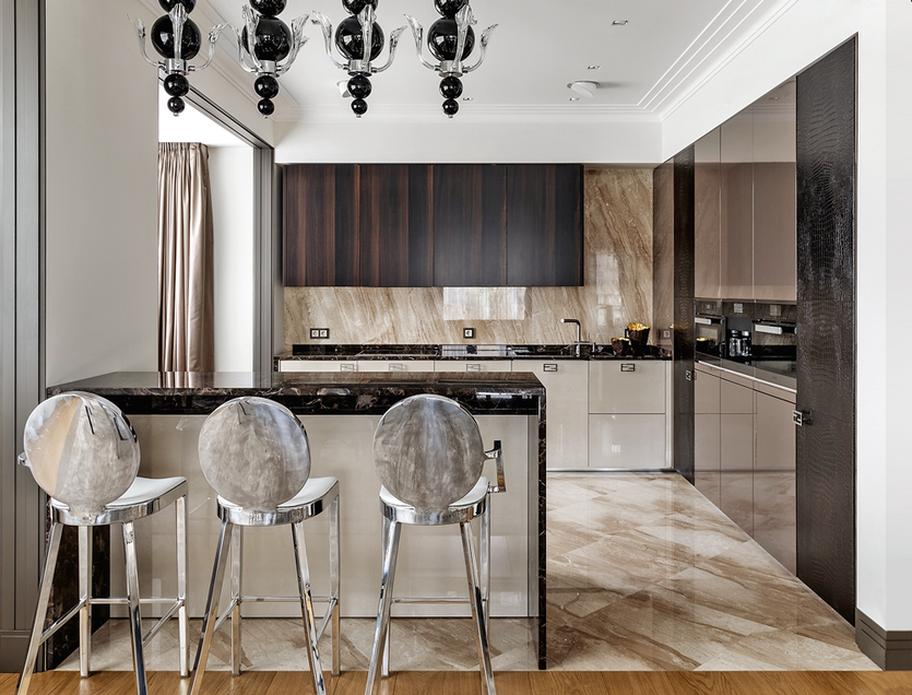 Стильная обстановка безупречно чистого помещения кухни в кремовых тонах определенно станет гордостью хозяев дома. Здесь захочется не только обедать, но и организовывать семейный досуг, празднование торжеств и без повода встречаться с друзьями, ведь атмосфера насквозь пропитана флюидами домашнего тепла и душевного покоя.