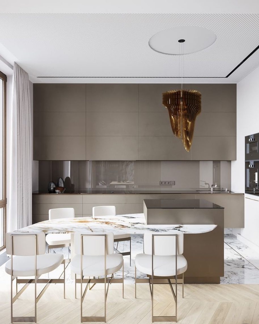 Во многих случаях возникает желание сделать кухню романтической, и одновременно уравновешенной, спокойной на вид. В таком случае пользуются кофейными и шоколадными оттенками. Кухни с патиной позволяют сделать обстановку более изысканной, и потому подобные решения используют в классических интерьерах. Независимо от конкретного варианта, есть строгие правила: