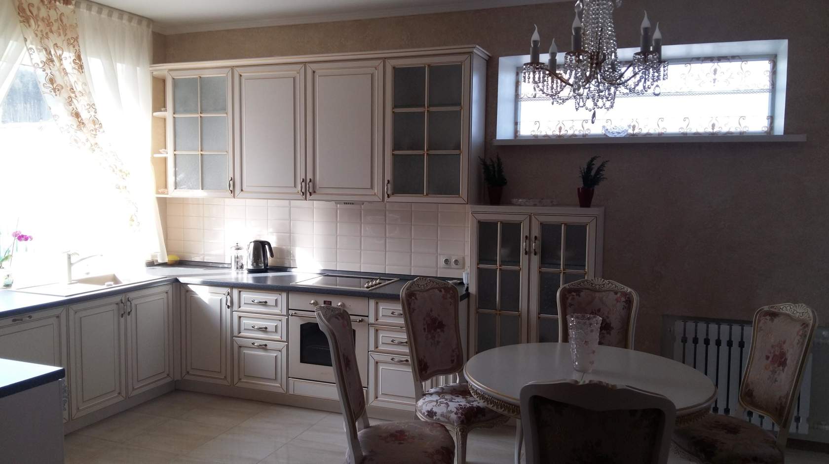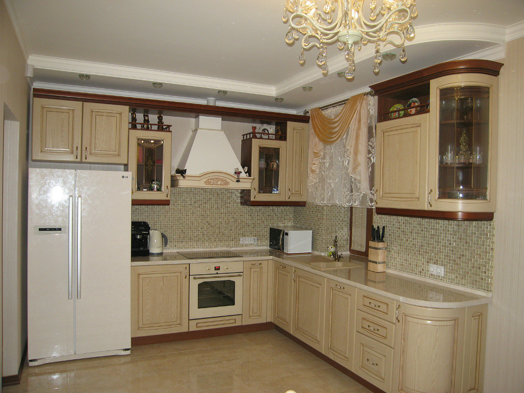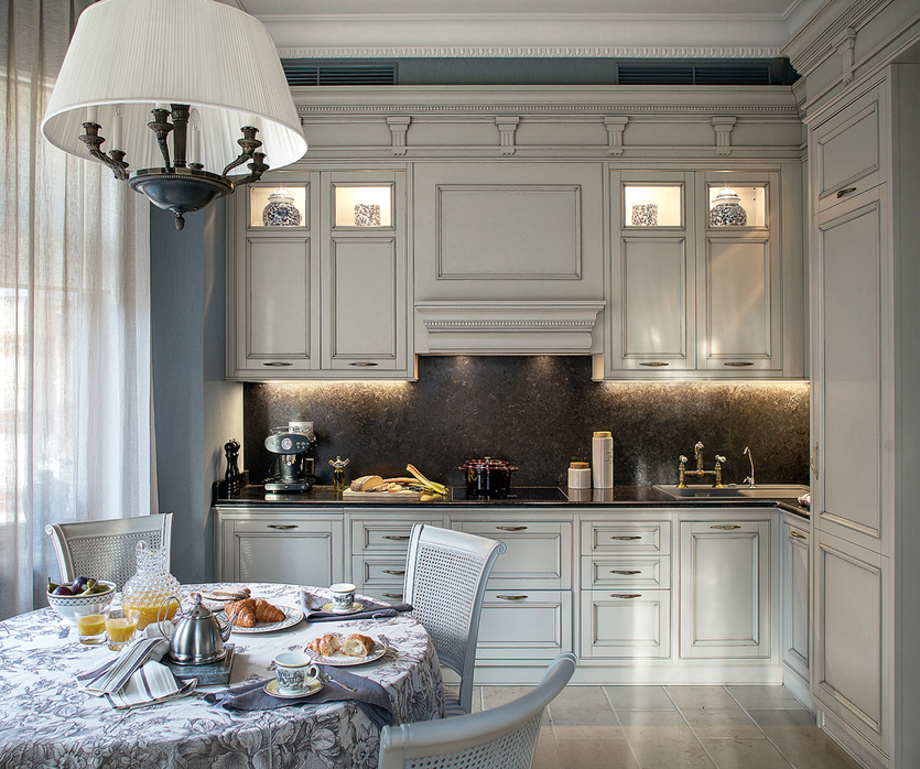 Богатство кухни в кремовых тонах подчеркнет патинированная фурнитура гарнитура, аксессуары серебряного и золотого цвета.
