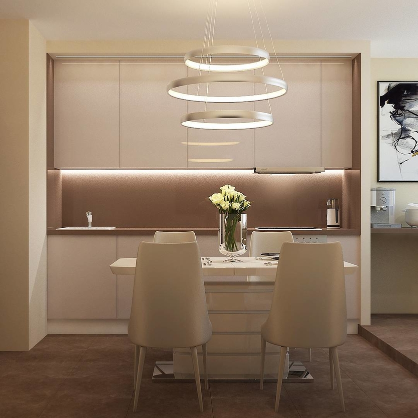 - Светодиоды и люминесцентные лампы отлично сочетаются с бежевым интерьером кухни, кроме того, они позволяют сэкономить на электроэнергии.