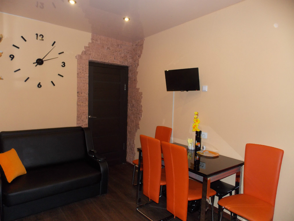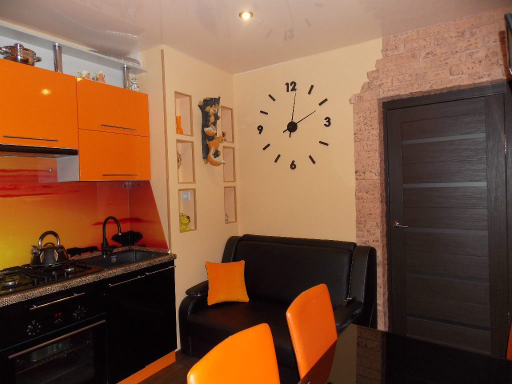 Однако в интерьере не должны присутствовать только эти два цвета. Их необходимо разбавить бежевыми или светлыми оттенками. К примеру, стены и потолок покрасить в белый цвет, установить кухонный гарнитур в черно-оранжевых тонах и сделать черным наливной пол.