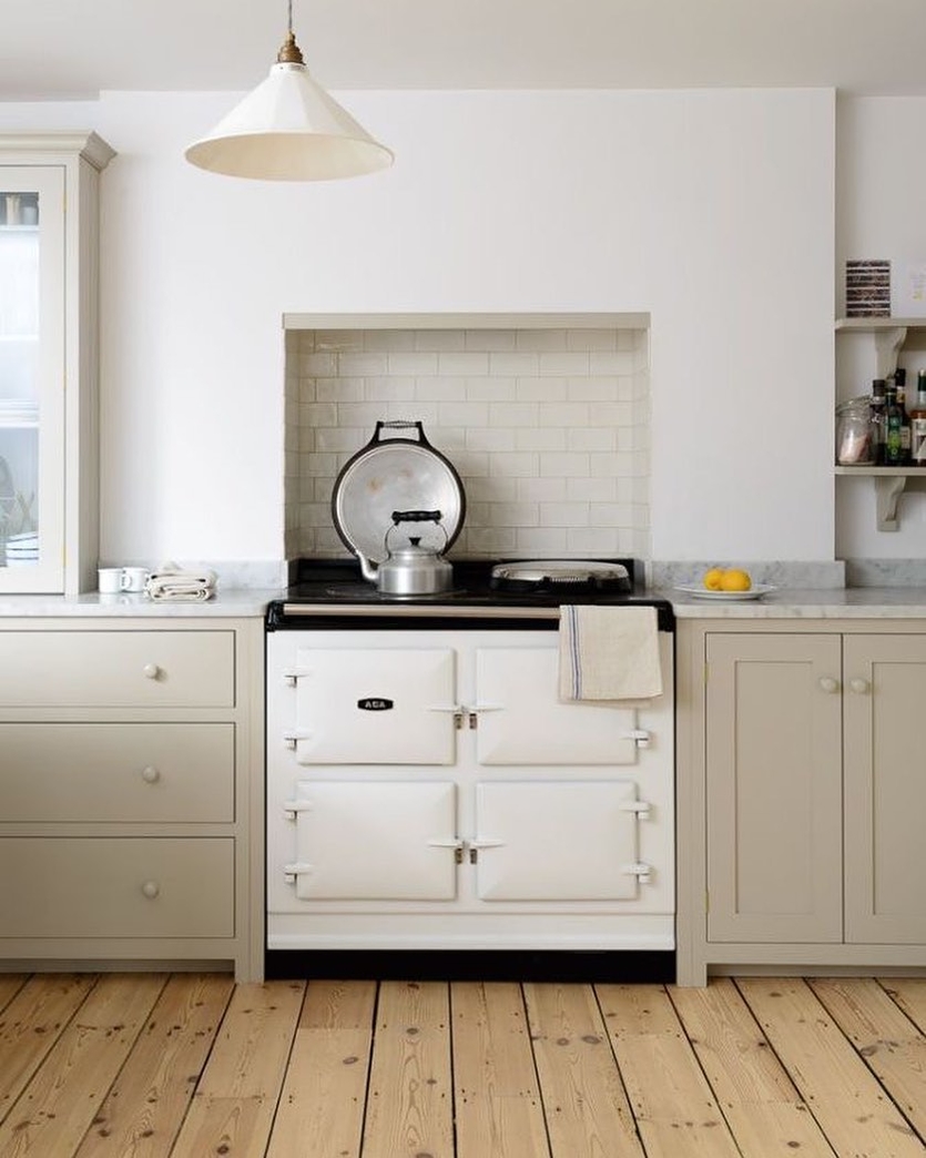 Приглушенные, словно выгоревшие на солнце, предметы меблировки и отделки кухонного пространства кремовых тонов безмолвно указывают на эстетику кантри, Прованса, скандинавского, колониального, этно-стиля. Этот естественный тон, излучающий свет, способствует созданию воздушной природной атмосферы.