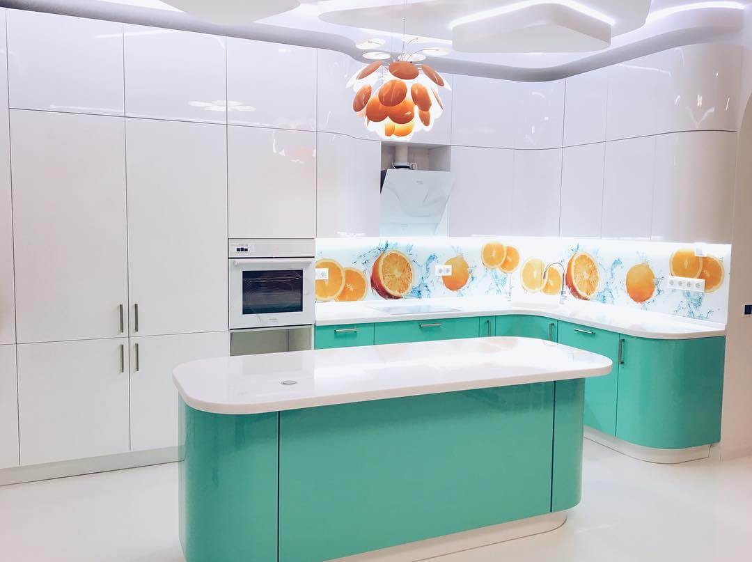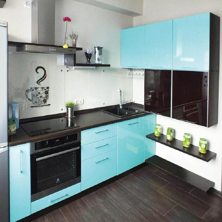 Такой можно сделать столешницу из искусственного камня или из пластика под камень. Неплохо будет смотреться фартук скинали из закаленного стекла с фотопечатью. Без светлых поверхностей соседство черного и бирюзового создаст угнетающее впечатление. Лучше пользоваться не чисто черным, а, например, темно-серым