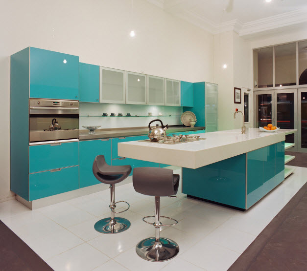 - Минималистичный стиль приобретает особую эффектность, если часть фасадов выполнена в бирюзовом тоне. Глянец придает поверхностям сходство с настоящим королевским камнем. Компаньоном к такому гарнитуру может стать древесный оттенок. При расстановке черных акцентов необходимо обеспечить присутствие большого количества светлых поверхностей в фоновой отделке.