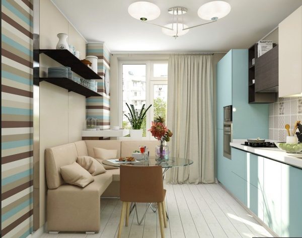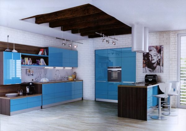Варианты потолочной отделки довольно ограничены. Самые популярные решения – это окрашивание в белый цвет и ПВХ-пленка. Для интерьера хай-тек можно использовать металлические балки, для прованса – из натуральной древесины или ее имитации. Для украшения потолка классической бирюзовой кухни подойдет белая лепнина. Если помещение оформлено в стиле модерн и высота потолков составляет свыше 2,5 м, можно создать двухуровневую гипсокартонную конструкцию.