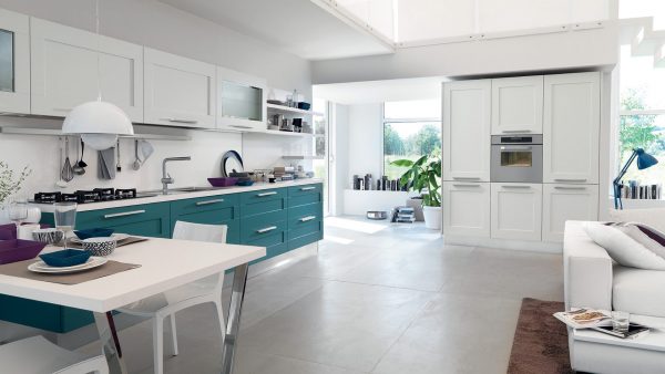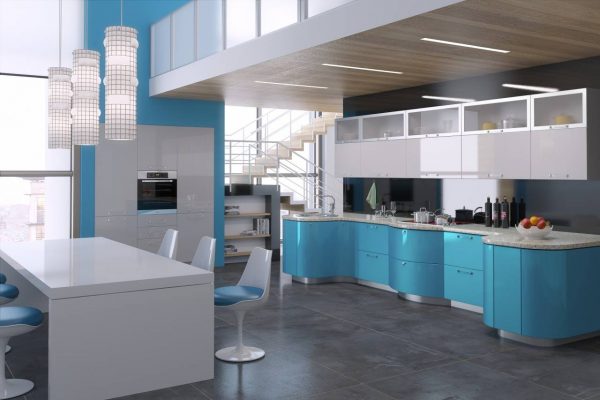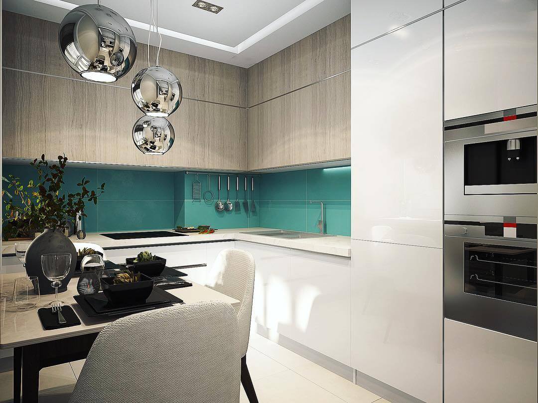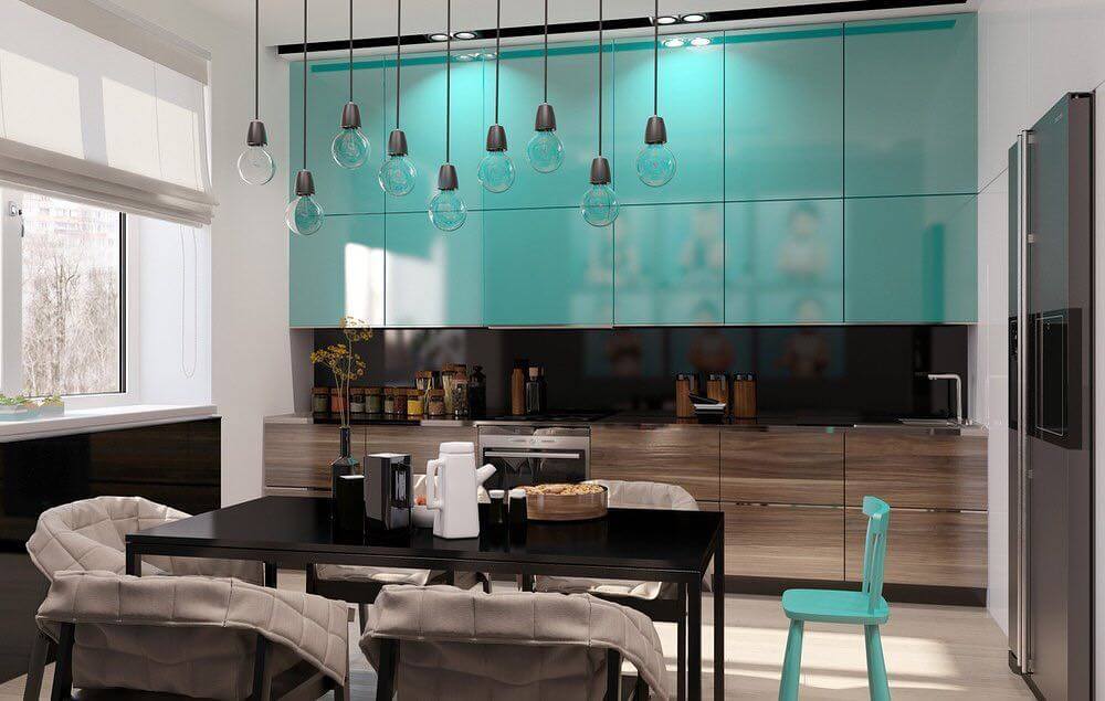 Когда дизайн интерьера позволяет нам добавлять декоративные детали и сочетать несколько акцентных тонов, роль бирюзы становится не настолько доминантной. Кухонный гарнитур в современном стиле стоит разбить на 1–2 секции разных цветов и добавить бирюзы за счёт декора либо выбрать светлый ненавязчивый бирюзовый оттенок.