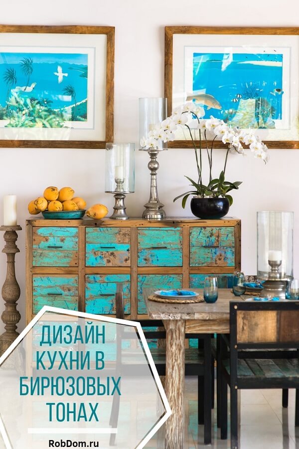 А теперь обсудим другие детали. В природе бирюза бывает зеленой, желтой с прожилками голубизны и зелени. Но чаще всего она напоминает цвет светлой морской волны с поднявшимися после бури на поверхность водорослями. Хотя в декоре принято применять чистый цвет, без прожилок.