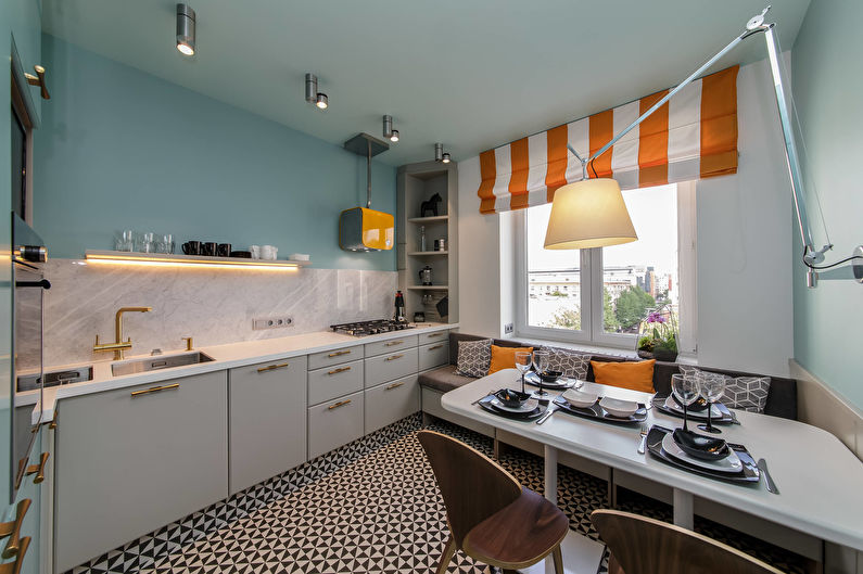 Сочетание бирюзового и серого цветов идеально смотрится на кухне, выходящей на южную, солнечную сторону.