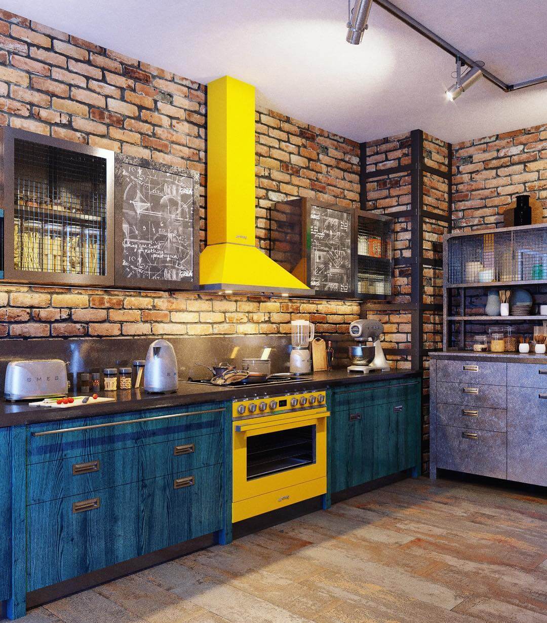 Бирюзовый и желтый вместе образуют яркое и выразительное сочетание. Если вы не хотите, чтобы комната выглядела слишком пестро, используйте эти два цвета в качестве акцентных. Например, бирюзовая мебель и желтый холодильник на фоне кирпичной стены. Интерьер, оформленный таким образом, будет радовать глаз и заряжать позитивом.