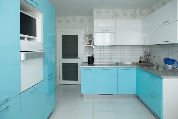 Светлая кухня, дополненная глянцевой бирюзовой мебелью