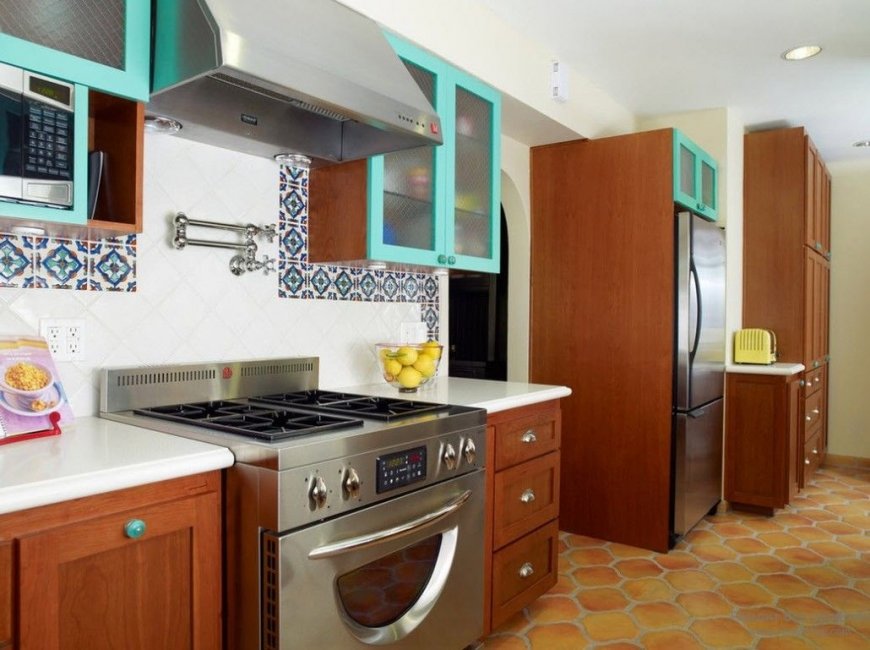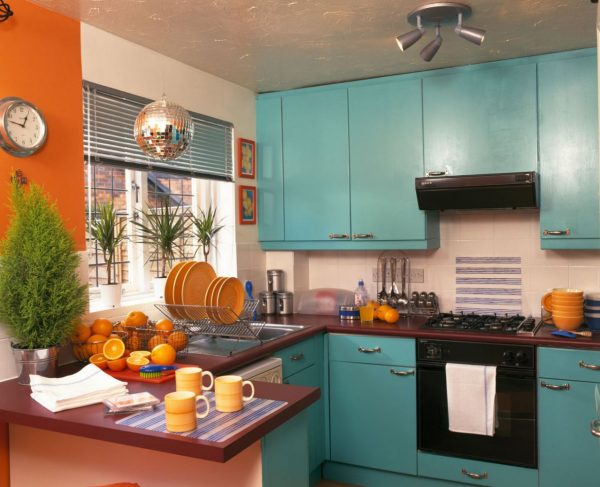 С помощью оранжевого фартука к дизайну бирюзовой кухни можно добавить теплые нотки.