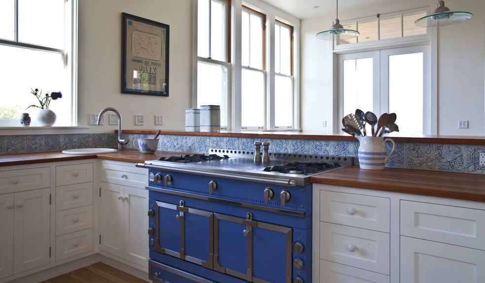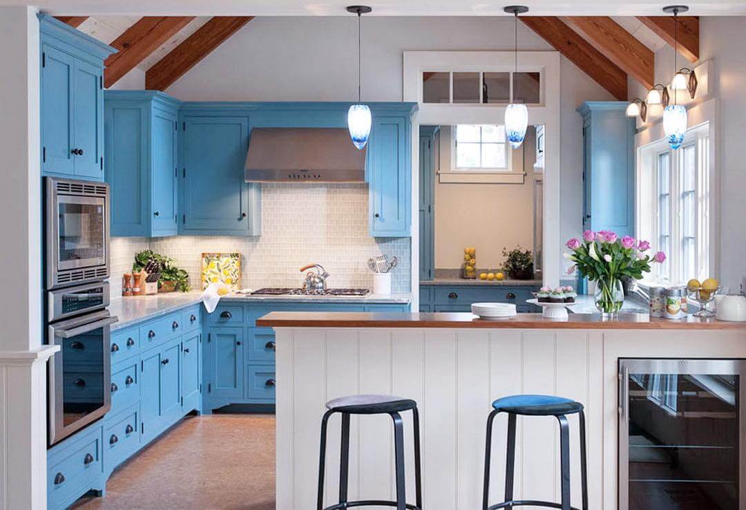 Как и большинство холодных оттенков, лазурный как будто раздвигает границы пространства, визуально увеличивая помещение, но для этого в нем должна быть значительная примесь белой краски. Лучшими компаньонами для кухонного гарнитура в небесных тонах являются такие цвета, как жемчужный, бежевый, песочный желтый, коричневый, серый