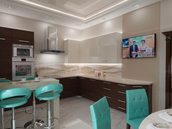 Бежево-бирюзовая кухня в интерьере классического стиля