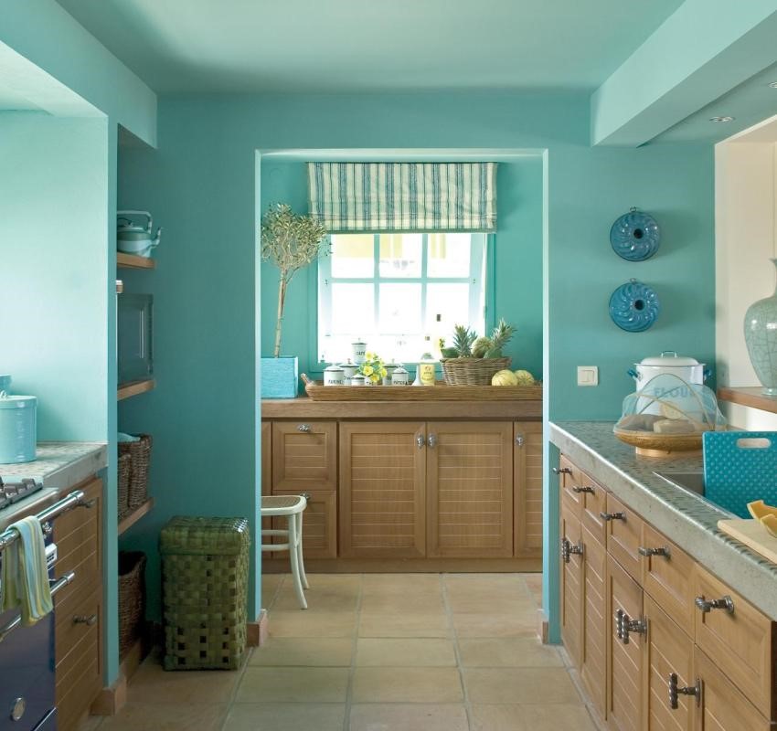 Наиболее практичная отделка для стен – окрашивание. Хорошим вариантом также являются обои, если они моющиеся. В просторных кухнях можно использовать фотополотна с морскими или горными пейзажами, которые подчеркивают свежесть бирюзы. Для деревенских стилей (прованс, кантри) подходят декоративные штукатурки с грубой фактурой.