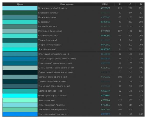 Бирюзовая палитра состоит из множества колеров. Вариации возникают при изменении пропорций в базовом сочетании голубого и зеленого цветов. Циан характеризуется небольшим количеством зеленой составляющей при наличии «ядовитого» синего компонента, более спокойный холодный оттенок имеет цвет ликера «Блю Кюрасао». Мятный и ментоловый колеры относятся к нежным и тепловатым разновидностям бирюзы. В современном дизайне все большую популярность приобретает оттенок «Тиффани», который выглядит как цвет листьев мяты с добавлением нотки голубизны.