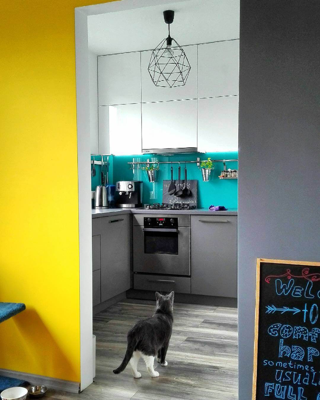 Несмотря черный «фартук» кухня не выглядит мрачно благодаря яркости желтого и бирюзового