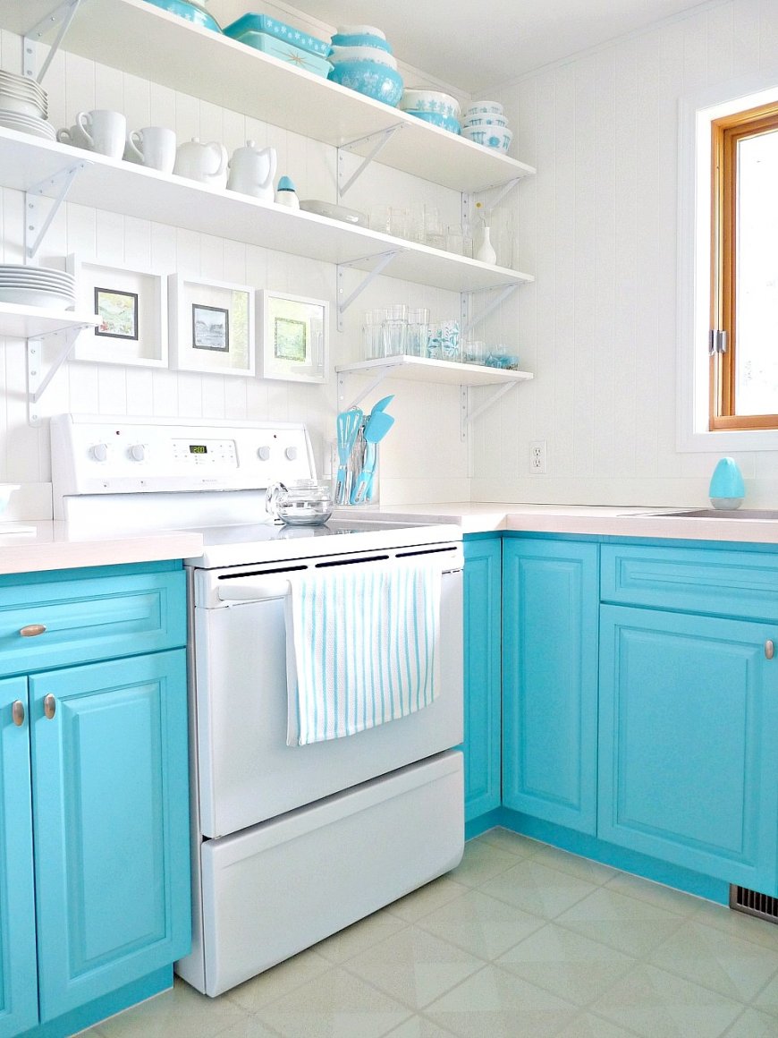 Благодаря бирюзовым вставкам белая кухня кажется стильной