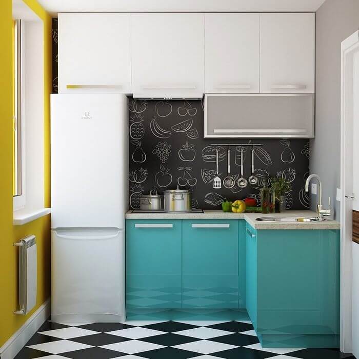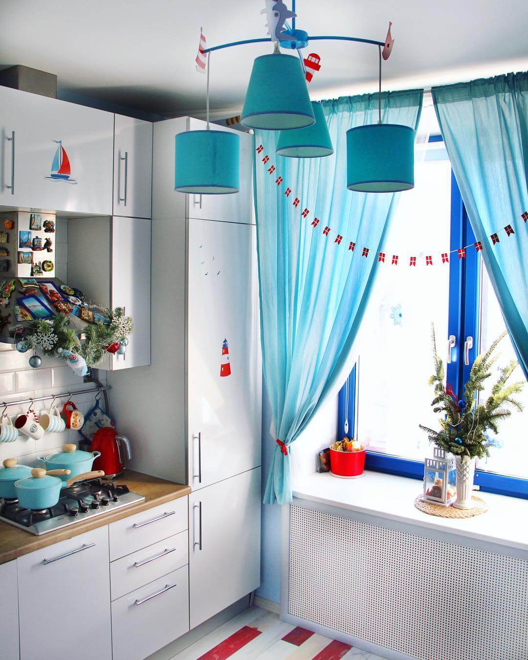 В этом случае помещение не будет выглядеть леденящим. Также можно добавить тепла можно с помощью ярких нот декора: сочного жёлтого, оранжевого или салатового цвета. Прохлада и свежесть морского бриза позволит выгодно расширить пространство маленькой кухни.