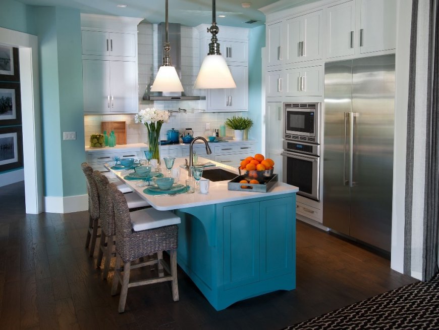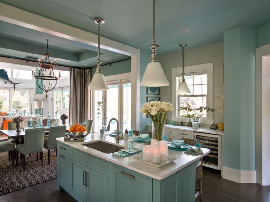Фэн-шуй рекомендует окрашивать в бирюзовый восточную стену кухни, это принесет богатство и гармонию в дом.