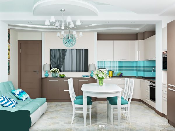 Сочетание с коричневым придает уникальный характер кухне. Коричневый обычно можно встретить в цвете мебели обеденной зоны или напольного покрытия, а бирюзовый – в цвете штор, скатерти, посуды, кухонного «фартука». Роскошно и богато выглядит сочетание темно-коричневого и светло-бирюзового.