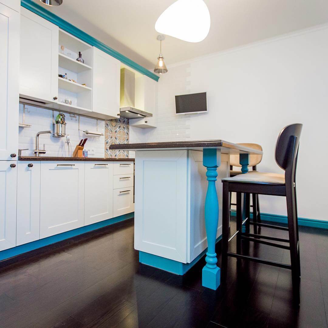Светлая бело-бирюзовая кухня, которая выглядит очень уютно