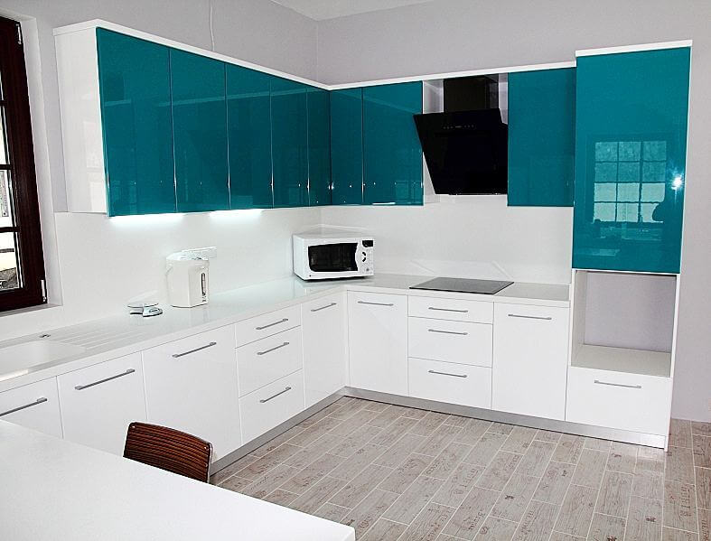 Бело бирюзовые кухни, встречаются весьма часто. Это лучший вариант, если помещение маленькое. Фартук можно сделать из закаленного стекла, мозаика и керамическая плитка также подойдут. Столешница белая. Ящики кухонного гарнитура, находящиеся наверху, должны иметь белый цвет, внизу, ближе к полу – бирюзовый.