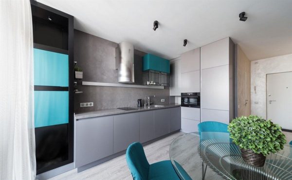 Комбинация серого и бирюзового гармонично смотрится на кухне, где предпочтение отдаётся технике и функциональности