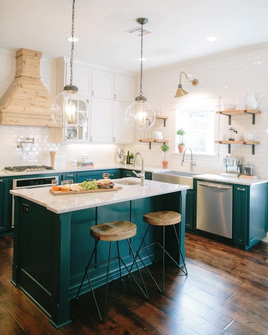 Белая кухня, обставленная состаренной бирюзовой мебелью