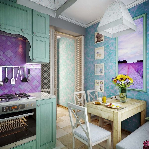 - Очень светлые варианты сине-зеленого оттенка подойдут для украшения прованс-кухни. Мягкий дизайн французской деревни подчеркнет комбинация пастельных бежевых и бирюзовых тонов.